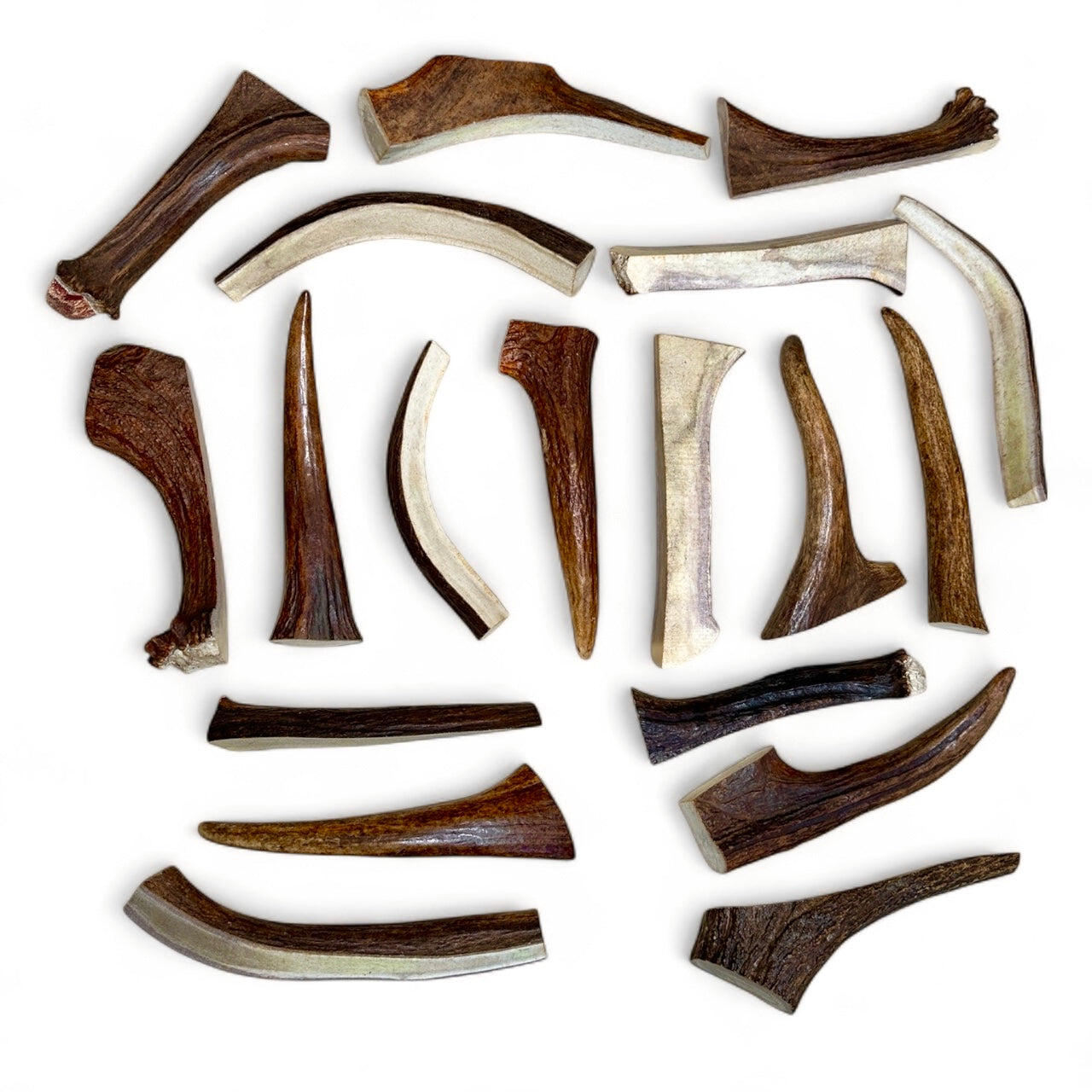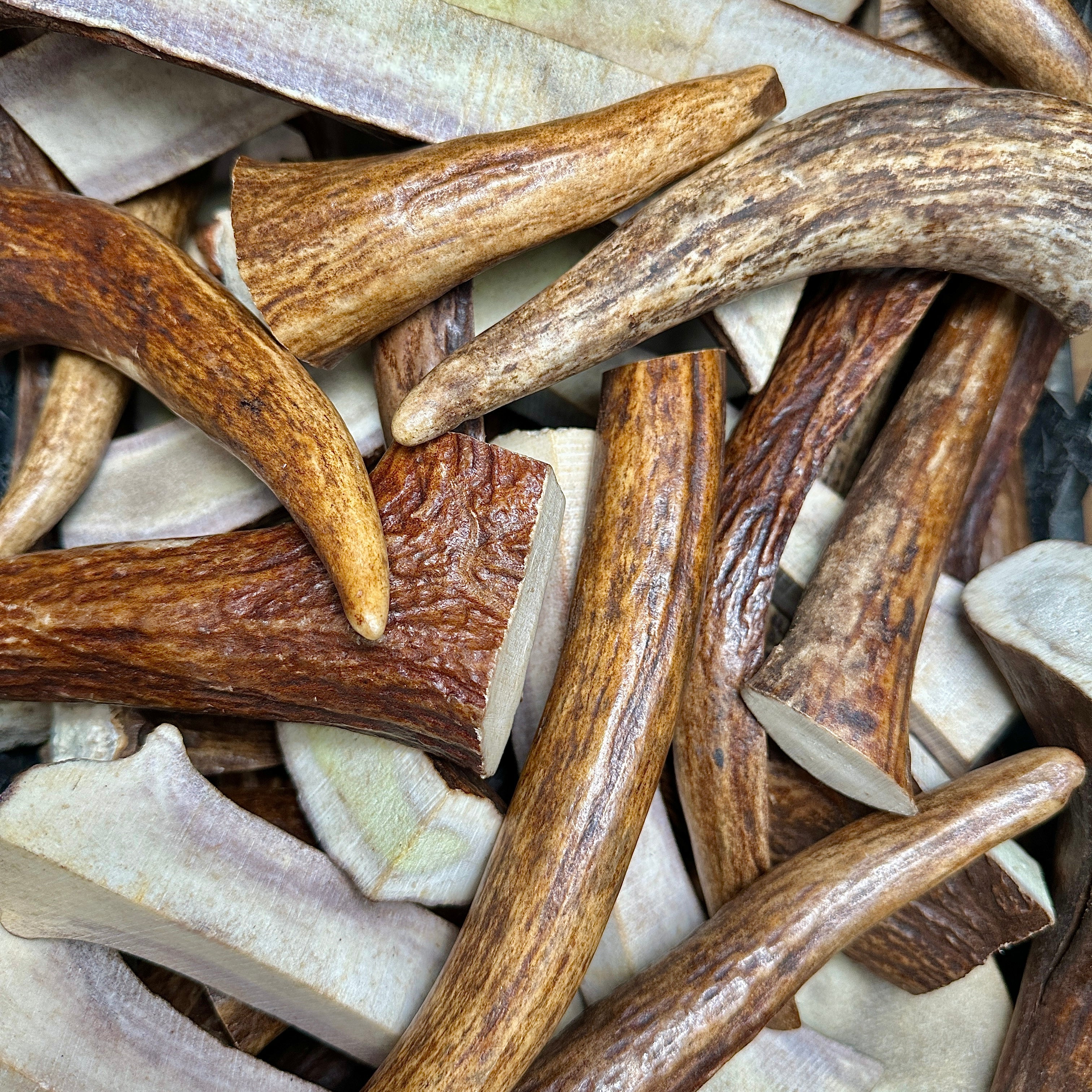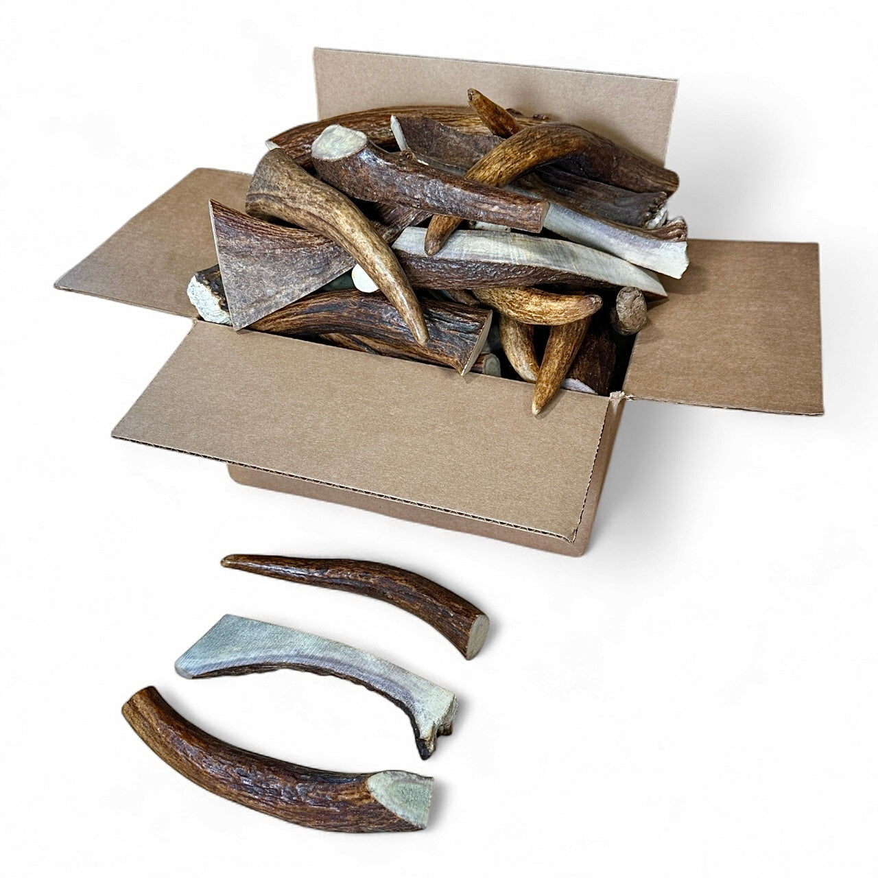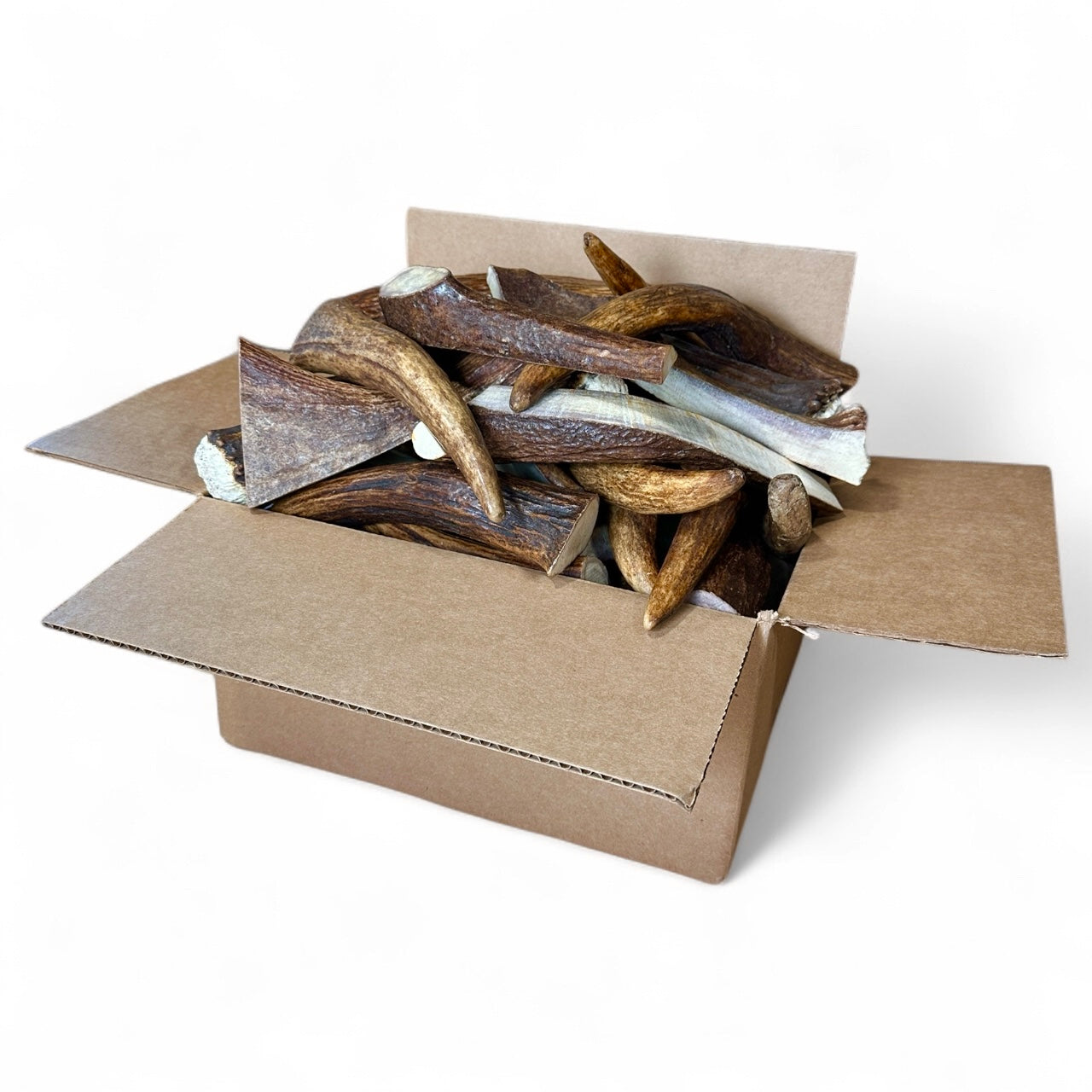 Each box is packed by hand with 5 pounds of 100% wild moose antlers, cut, sanded, and ready to chew.