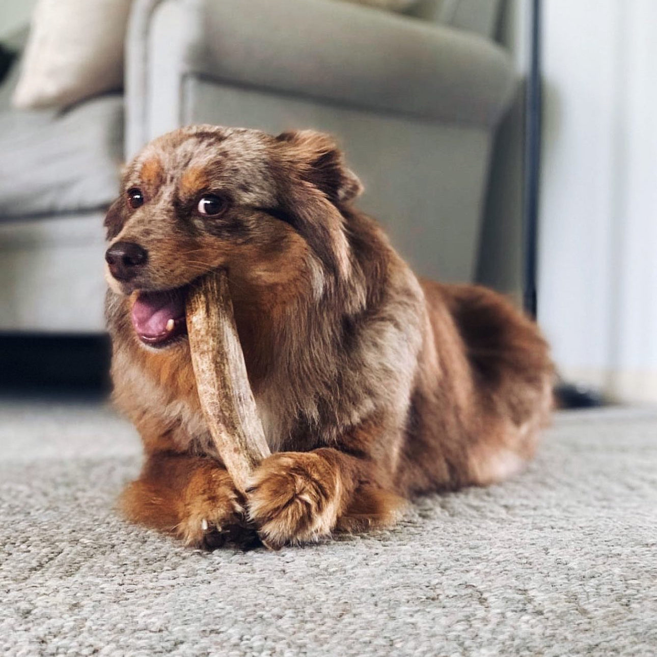 When the antler becomes small enough to fit fully inside your dog’s mouth, it’s time to replace it with a fresh antler chew.