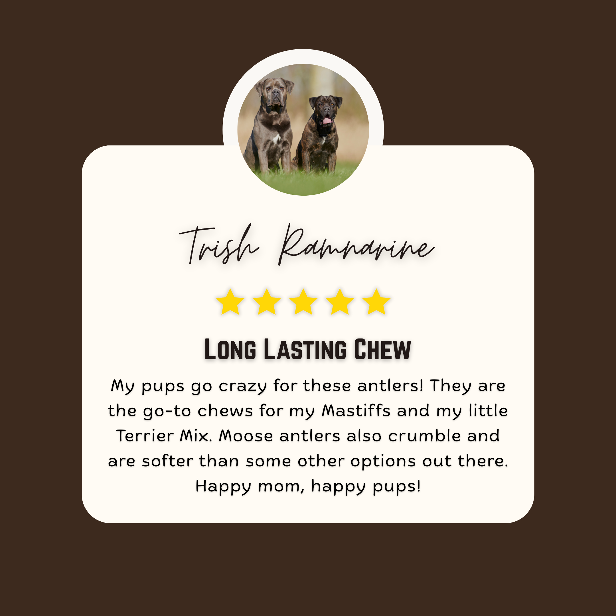 Moose antlers are denser and less brittle than deer or elk, which allows for slower, more controlled wear. They also contain more marrow, keeping dogs engaged longer while reducing the chance of splintering when properly sized. For heavy chewers, this typically means fewer replacements over time.