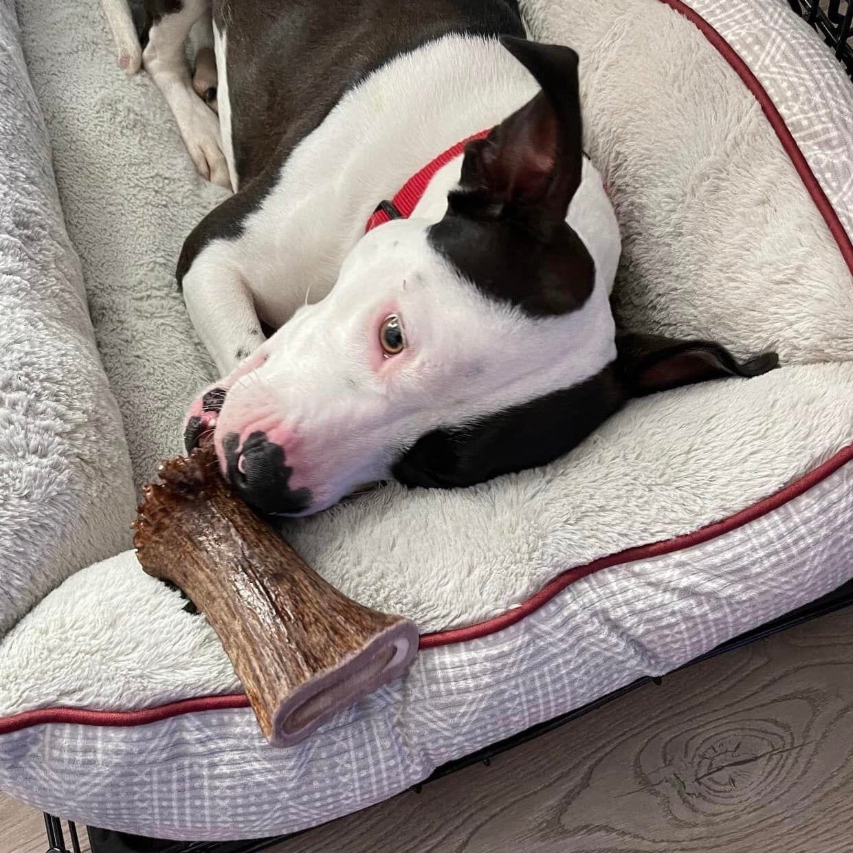 When the antler becomes small enough to fit fully inside your dog’s mouth, it’s time to replace it with a fresh antler chew.