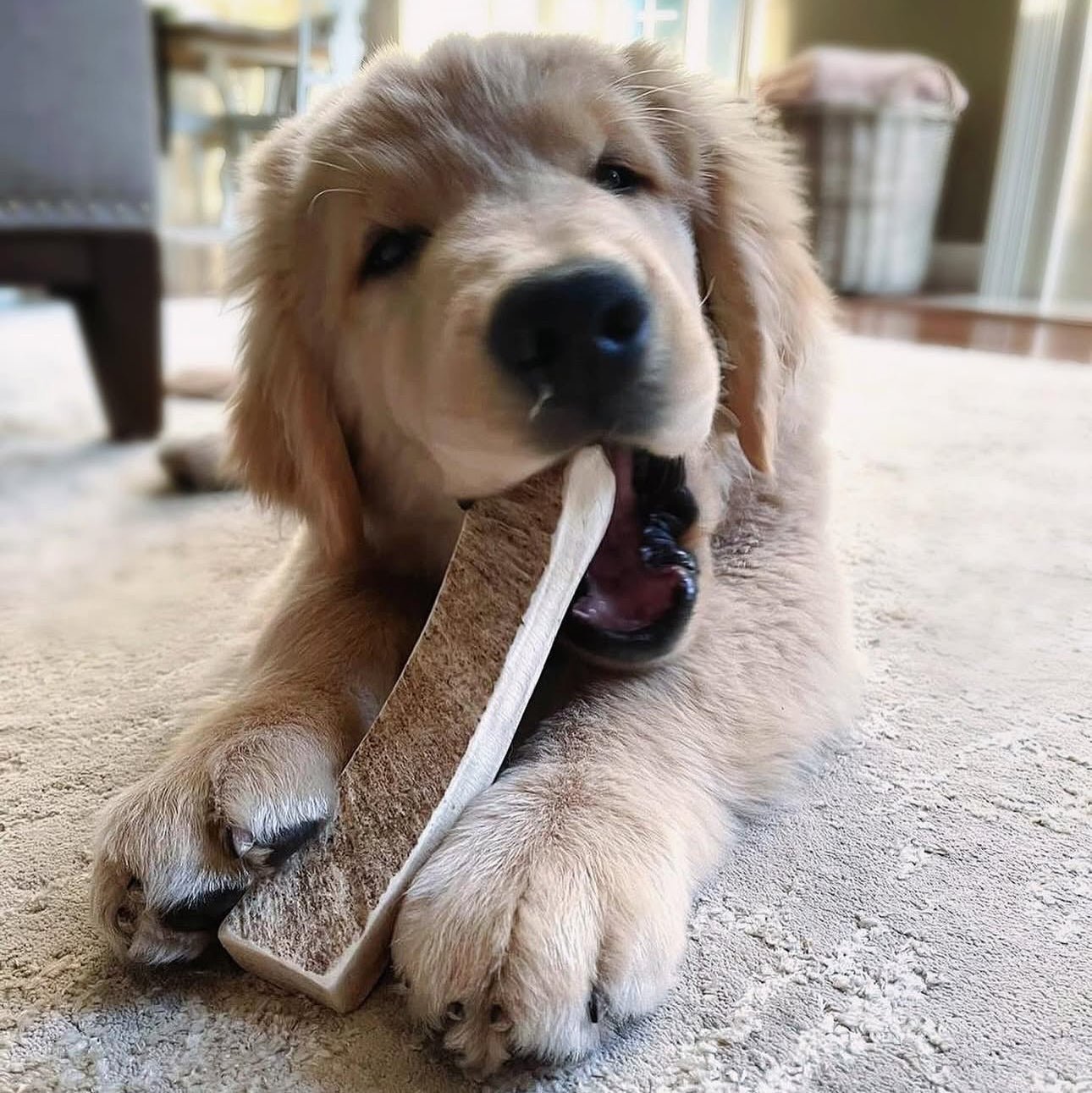 When the antler becomes small enough to fit fully inside your dog’s mouth, it’s time to replace it with a fresh antler chew.
